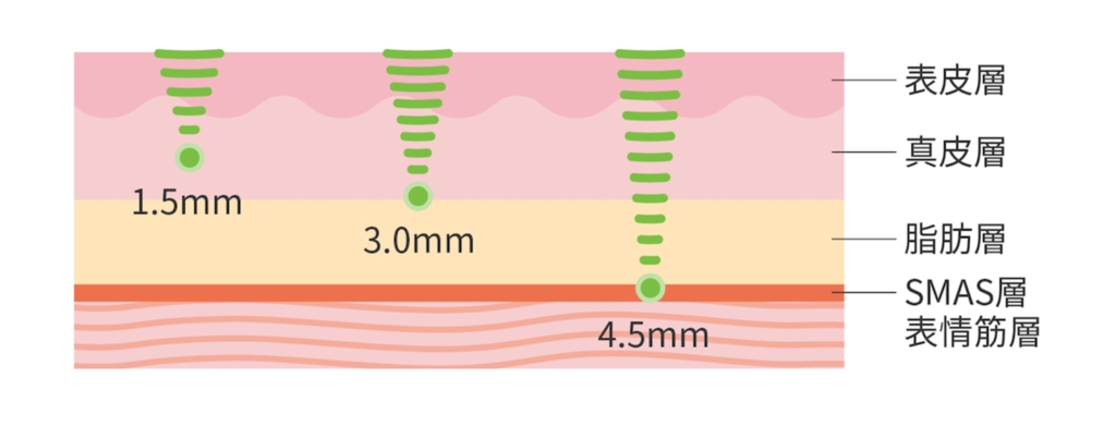 まずドット照射とは、皮膚の土体となるSMAS筋膜層へ点状に熱を加える事によってSMAS筋膜が収縮されリフトアップの効果が得られます。