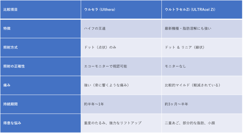 「ハイフの王様」として君臨するウルセラ、そして「リフトアップ&脂肪溶解のダブル効果と痛みの少なさ」という武器を持つ最新のウルトラセルZi。